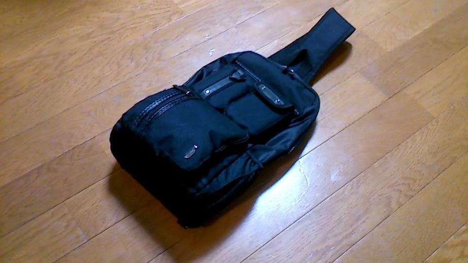 今回はこれ。A4サイズの書類がちょっと曲げたら入るかな程度の大きさのワンショルダー1つ。