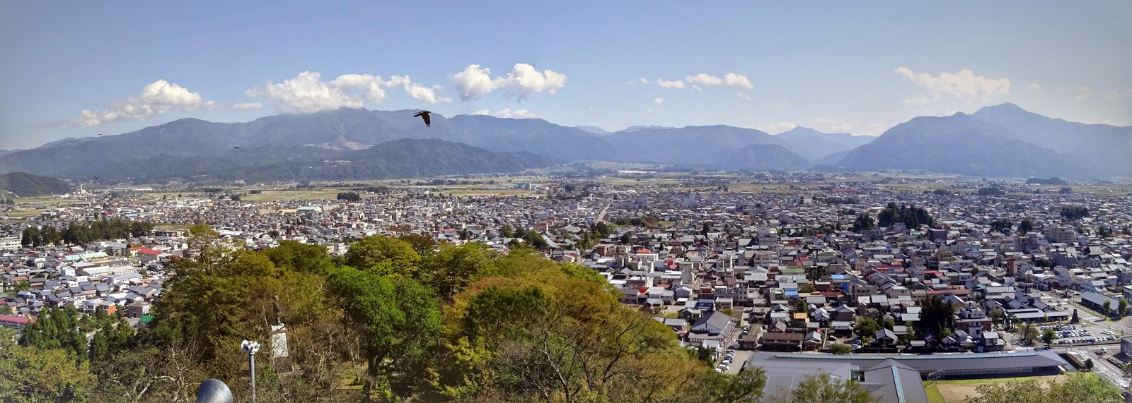天守閣から大野市街地を望む。高い建物がなく、盆地に静かに広がるいいまちだ。左のほうの山の向こうにわずかに白山が見えた。(写真にも写っているはずだがよくわからない)