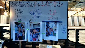並行してやっていたのが、これも恒例の「がきんちょチャンピオン」。今年はコマ回し(持続時間)、おじゃみ(お手玉。個数×持続時間)、そしてけん玉(連続成功回数)を競う。ただ記録と写真と名前が掲示されるだけだが、けっこう燃える子は燃える。